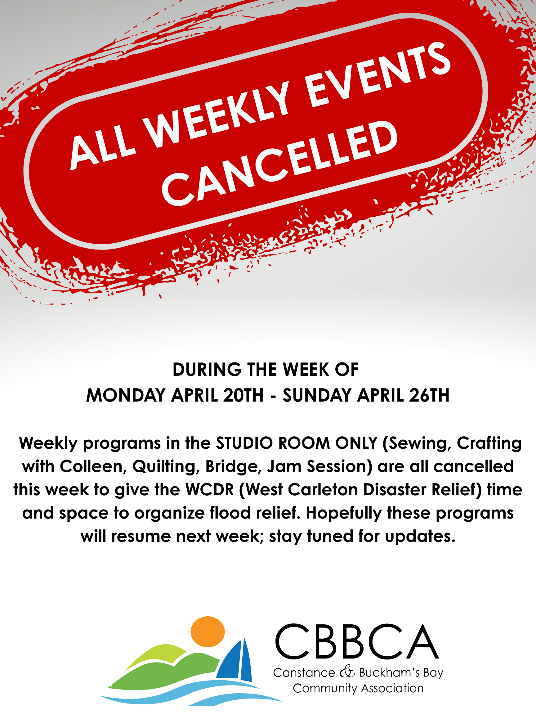 All of our weekly programs in the Studio Room Only (Sewing, Crafting with Colleen, Quilting, Bridge, Jam Session) are cancelled this week to give the WCDR (West Carleton Disaster Relief) time and space to organize flood relief.