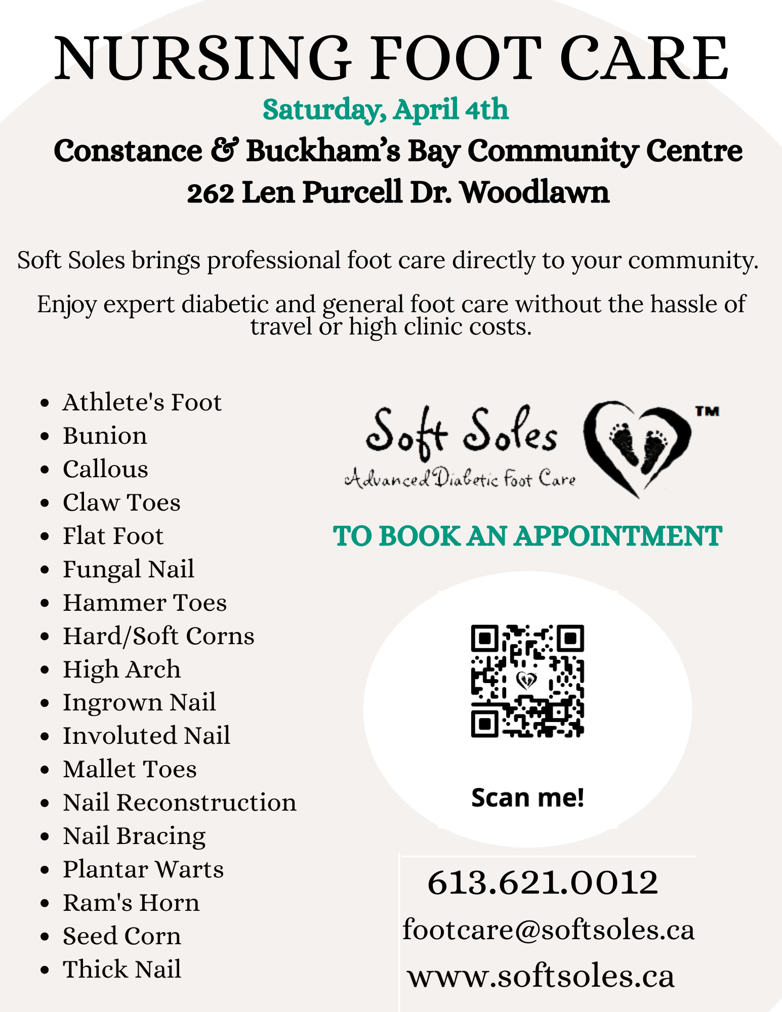 Book an appointment by either scanning the QR code (in the poster) or by sending an email to footcare@softsoles.ca
